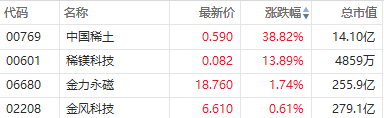 受此消息提振,相关概念股大幅走强。截至收盘,中国稀土涨近40%,金力永磁涨近2%。
