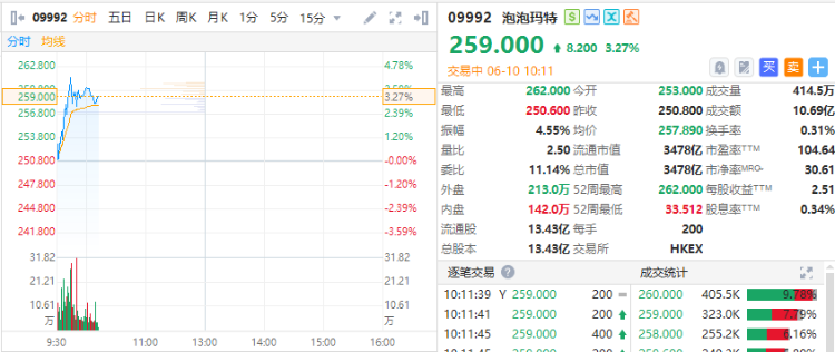 泡泡玛特 $09992.HK 涨超3%,高见262港元续刷历史新高,年内股价累涨近1.9倍。截至发稿,涨3.27%,报259港元,成交额10.69亿港元。