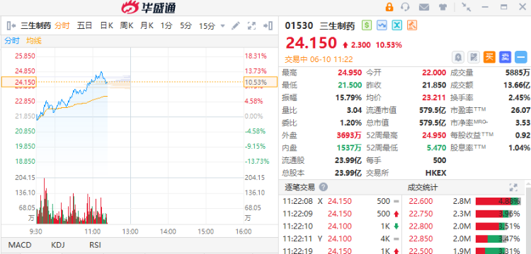 6月10日,三生制药(01530)再度走强,高见24.95港元创历史新高。截至发稿,涨10.53%,报24.15港元,成交额13.66亿港元。