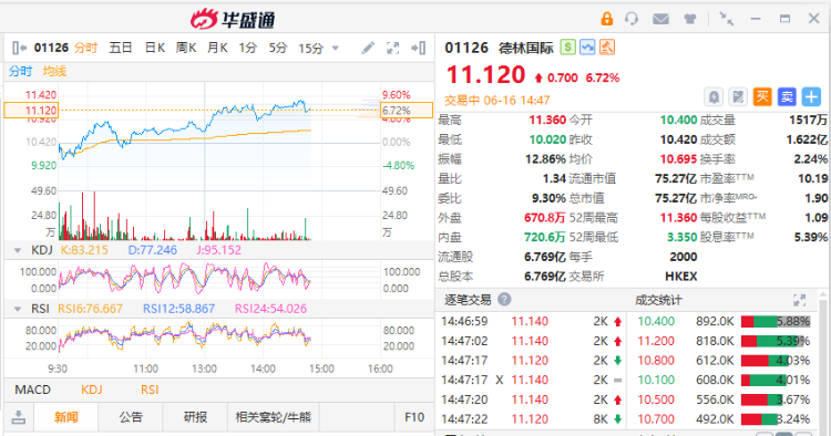 6月16日消息,德林国际盘中再涨超8%,高见11.3港元再创历史新高。该股近期持续走高,月内股价已累涨97%。截至发稿,涨6.72%,报11.12港元。