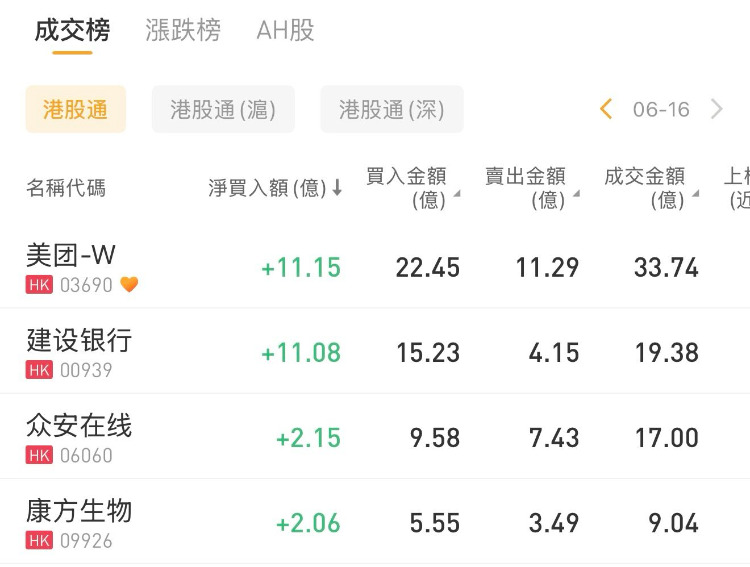 美团-W、建设银行、众安在线分别获净买入11.15亿港元、11.08亿港元、2.15亿港元;