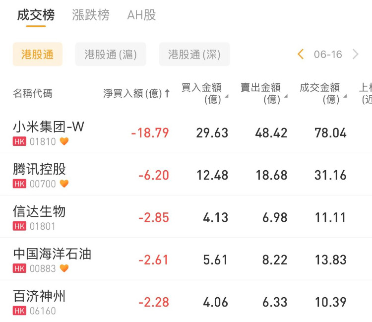 小米集团-W、腾讯控股、信达生物分别遭净卖出18.79亿港元、6.20亿港元、2.85亿港元。