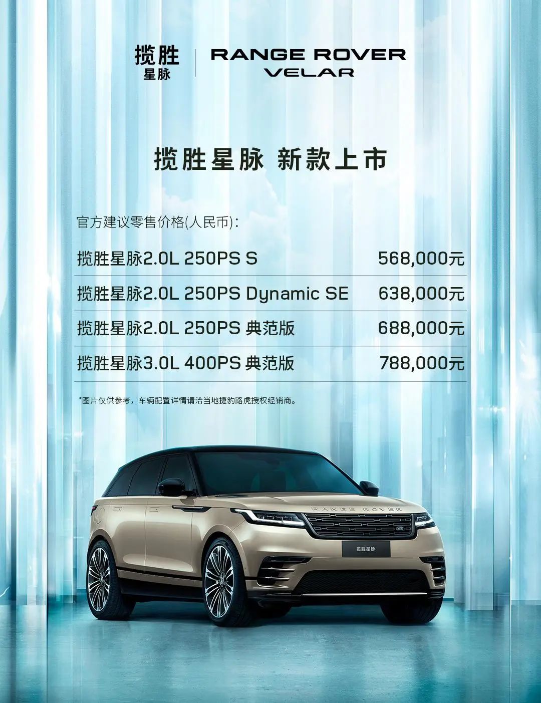 日前,路虎官方宣布,旗下的新款路虎揽胜星脉上市,新车提供四种配置可选,官方指导价区间为56.8万元-78.8万元。和老款车型相比,新款车型取消了250PS Dynamic HSE版本,但新增了250PS典范版。