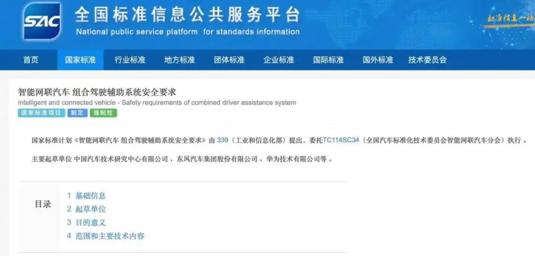 近日,全国标准信息公共服务平台公示了关于征求《智能网联汽车组合驾驶辅助系统安全要求》拟立项强制性国家标准项目意见的通知(以下简称“通知”)。该标准计划由工信部提出,委托全国汽车标准化技术委员会智能网联汽车分会执行,项目周期为22个月,主要起草单位包括中国汽车技术研究中心有限公司、东风汽车集团股份有限公司、华为技术有限公司等。
