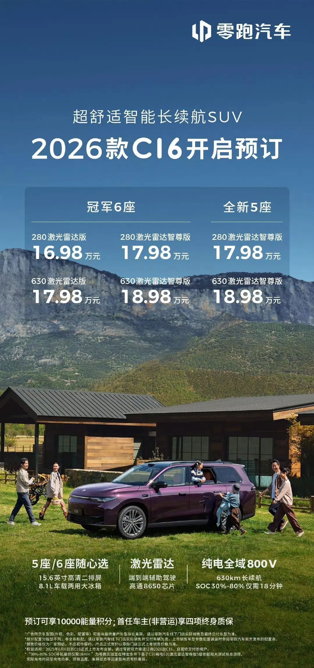 6月6日,2026款零跑C16开启预售,新车共推出6款车型,预售价16.98-18.98万元。新款车型除了增加续航之外,还全系标配激光雷达,并针对舒适性配置进行升级。另外,新车在保留6座版车型之外,还推出了5座版本,后排的空间更大。