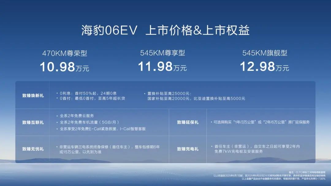 在今年的重庆车展上,比亚迪旗下全新中型轿车——海豹06EV正式上市,新车共推出3款车型,售价区间10.98-12.98万元。作为秦L EV的姊妹车型,海豹06EV归属海洋网系列,全系搭载比亚迪全栈自研“天神之眼C”智能驾驶辅助三目版。
