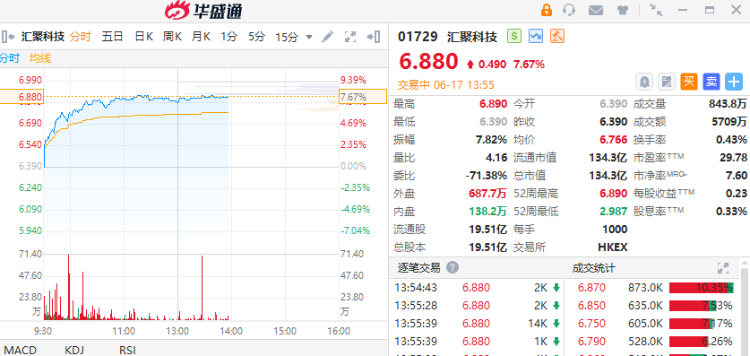 6月17日,汇聚科技(01729)早盘再度走强,高见6.89港元再创历史新高,月内累涨已超30%。截至发稿,涨7.67%,报6.88港元,成交额5709万港元。
