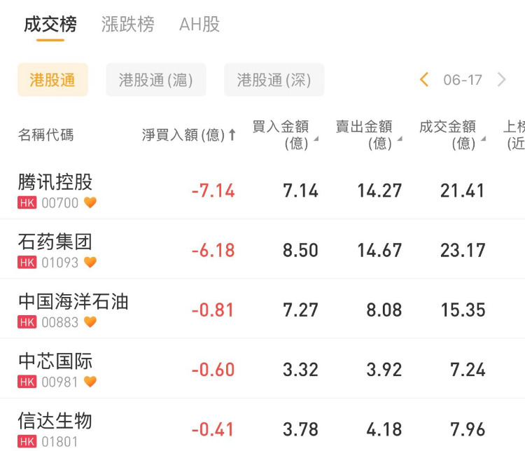 腾讯控股、石药集团、中国海洋石油分别遭净卖出7.14亿港元、6.18亿港元、0.81亿港元。
