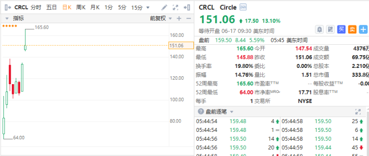 此次减持正值Circle股价飙升之际。6月17日,其股价盘中一度触及165.60美元,最终收于151.06美元的历史新高。自6月5日以31美元的发行价上市以来,其股价累计上涨约387%。