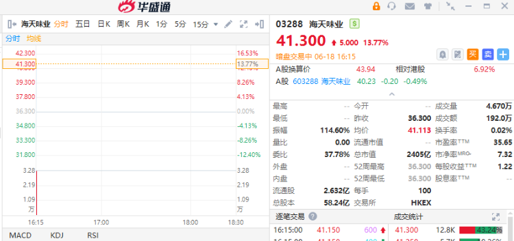 华盛资讯06月18日讯,港股海天味业正在暗盘交易中,截至发稿涨13.77%,报41.3港元/股,中签一手赚500港元,最新总市值超2405亿港元。该股预计将于6月19日正式挂牌上市,配售结果将于今日晚间披露。