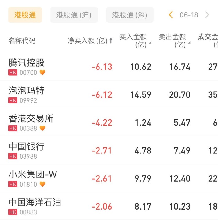 腾讯控股、泡泡玛特、 香港交易所分别遭净卖出6.13亿港元、6.12亿港元、4.22亿港元。