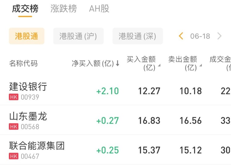 建设银行、山东墨龙、联合能源集团分别获净买入2.1亿港元、2,655万港元、2,490万港元;
