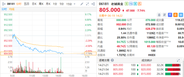 老铺黄金 $06181.HK 再跌超7%,截至发稿,跌7.74%,报805港元,成交额9.881亿港元。本周已回落超15%,公司本月底将迎来大规模限售股解禁。