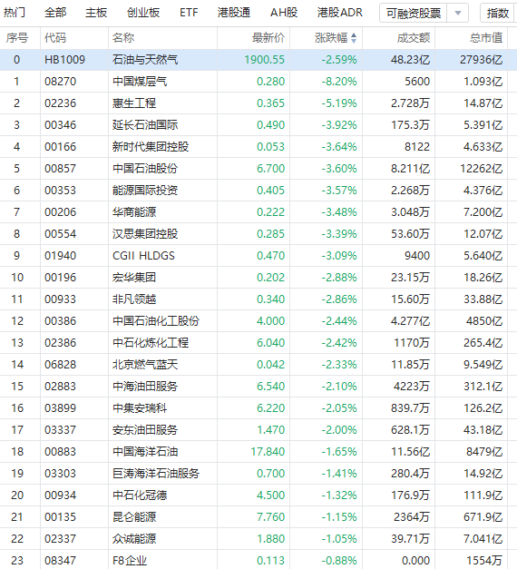 石油股全线走低,截至发稿,中石油(00857)跌3.64%,报6.7港元;中石化(00386)跌2.44%,报4港元;中海油(00883)跌1.65%,报17.84港元。