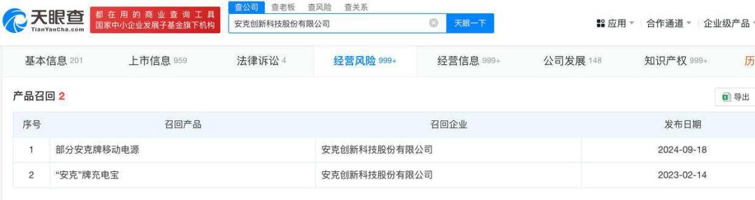 2024年6月,安克宣布召回在2023年3月后生产的安克321移动电源(型号 A1112),原因是该型号产品存在火灾隐患;同年9月,安克宣布召回2023年12月至2024年4月期间制造的多款移动电源,涉及数量为4501件。