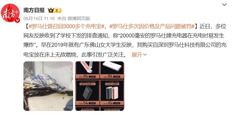 早在2019年,就有媒体报道曝光广东佛山一名女大学生购买的罗马仕充电宝在床上无故燃烧,此事引发广泛关注。随后,罗马仕向国家市场监管总局备案了召回计划,自2019年11月4日起召回两批次OM10型号移动电源,并表示该部分移动电源存在过热燃烧风险。
