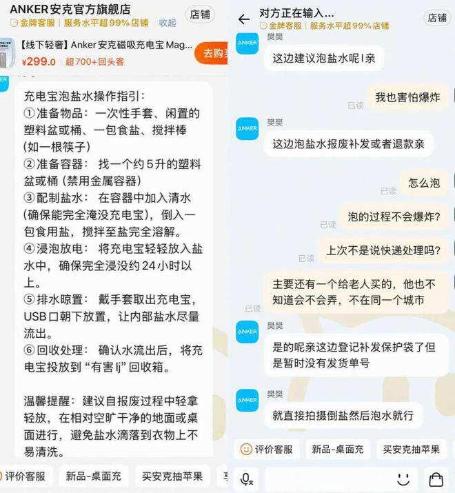 更令人诟病的是,国内消费者在申请召回过程中遭遇了极大的不透明与不便。有网友联系其淘宝客服未果,转而咨询安克官方公众号,客服竟然建议“将充电宝浸泡在盐水中24小时后报废”,才可以启动退款或换货。这一做法不仅操作复杂,更缺乏安全保障,这位网友质疑道:“我怎么敢把电池泡在水里?泡的过程不会爆炸吗?”
