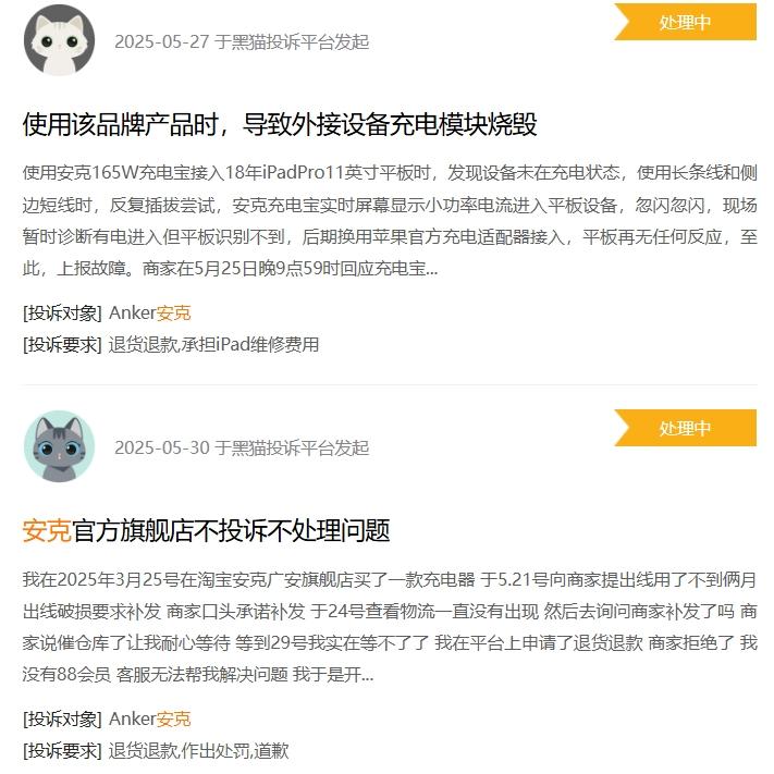 此外,在社媒平台和“黑猫投诉”平台上,也有不少消费者对安克移动电源产品的投诉,投诉内容大多涉及安克充电宝存在质量缺陷、虚假宣传、产品过热、售后服务等问题。