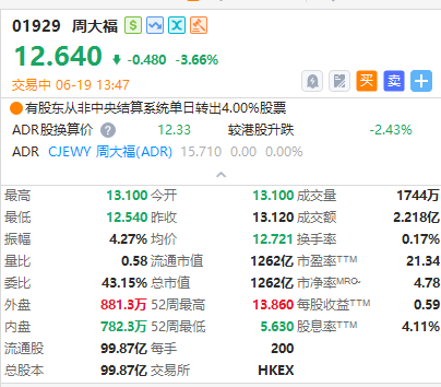 周大福(01929)再跌近4%,截至发稿,跌3.66%,报12.64港元,成交额2.21亿港元。