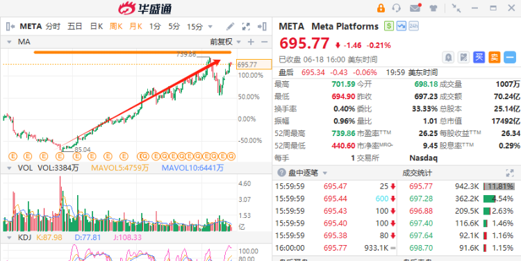 截至本周三收盘,Meta股价自2022年11月低点以来累计上涨约683%。