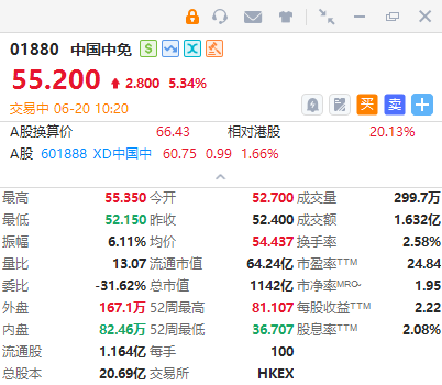 中国中免(01880)早盘涨超5%,截至发稿,涨5.34%,报55.2港元,成交额1.632亿港元。