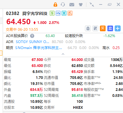 舜宇光学(02382)盘中一度涨超7%,截至发稿,涨2.87%,报64.45港元,成交额8.544亿港元。