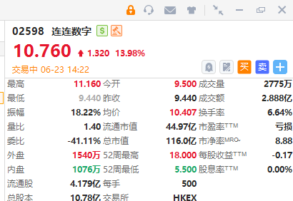 连连数字(02598)涨近14%,截至发稿,涨13.98%,报10.76港元,成交额2.888亿港元。