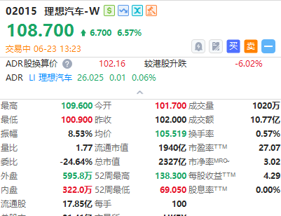 理想汽车-W(02015)午后涨超6%,截至发稿,涨6.57%,报108.7港元,成交额10.77亿港元。