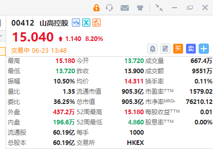 高控股(00412)涨超8%,截至发稿,涨8.2%,报15.04港元,成交额9551万港元。