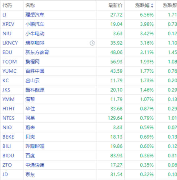 理想汽车涨超6%,小鹏汽车、小牛电动、瑞幸咖啡涨超3%,金山云、晶科能源涨超1%,网易、蔚来、贝壳跟涨。