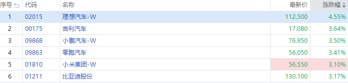 6月24日消息,港股新能源车股全线上扬,理想汽车涨超4%,吉利汽车、小米集团、小鹏汽车涨超3%。