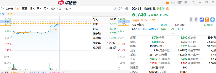 龙蟠科技(02465)涨超11%,截至发稿,涨11.4%,报6.74港元,成交额2.564亿港元。