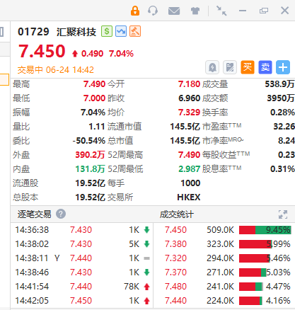 汇聚科技(01729)再涨超7%,高见7.49港元创历史新高,月内累计涨幅超四成。截至发稿,涨7.04%,报7.45港元,成交额3950万港元。