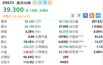 农夫山泉(09633)午后发力走高,截至发稿,报39.3港元,涨幅3.56%,成交额1.546亿港元。