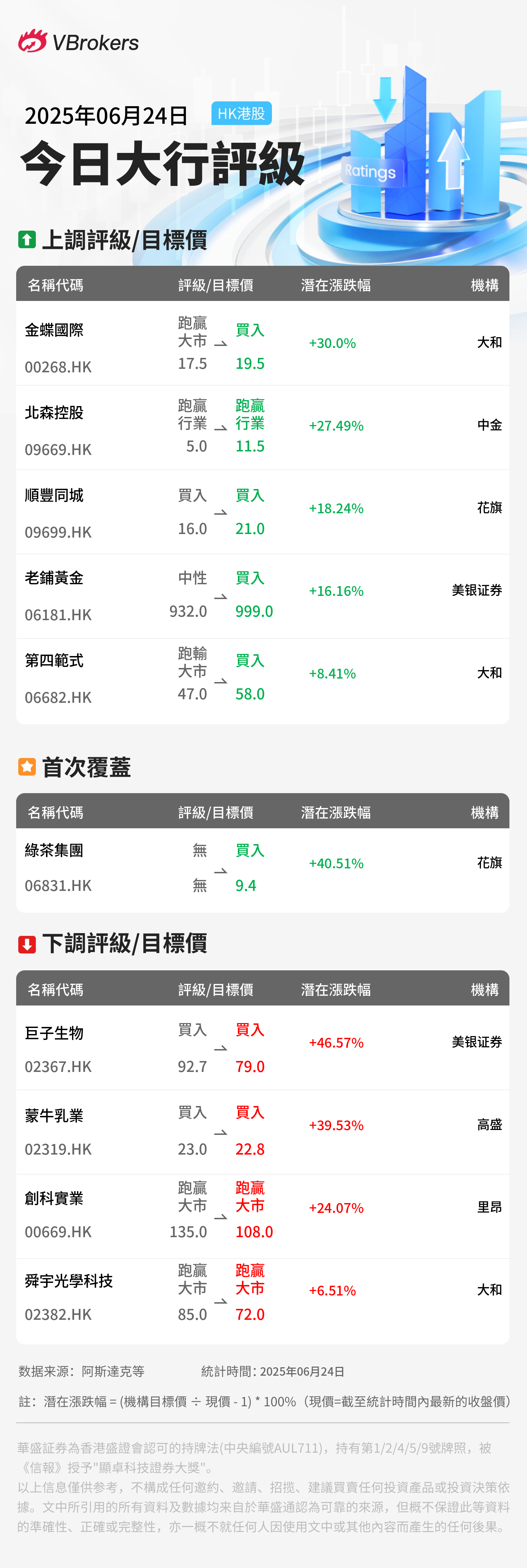 | 老铺黄金 | 06181.HK | 上调 | $999.0 | $860.0 | 16.16% | 美银证券 |