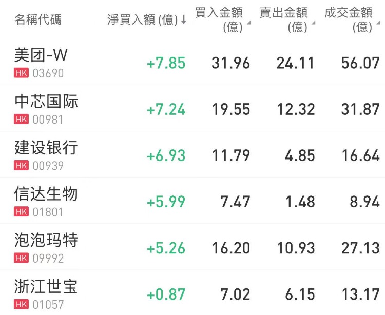 美团-W、中芯国际、建设银行分别获净买入7.85亿港元、7.24亿港元、6.93亿港元;