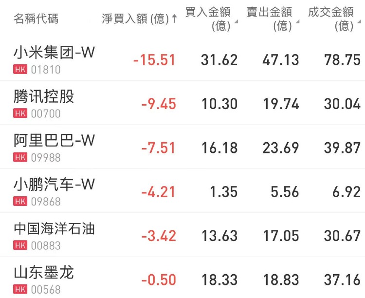 小米集团-W、腾讯控股、阿里巴巴-W分别遭净卖出15.51亿港元、9.45亿港元、7.51亿港元。