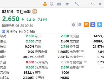 华盛资讯06月25日讯,港股香江电器今日挂牌,截至发稿跌7.34%,报2.65港元/股,中签一手账面浮亏210.0港元,最新总市值超7.23亿港元。该股此前公开发售获852.38倍认购,一手中签率10.0%。