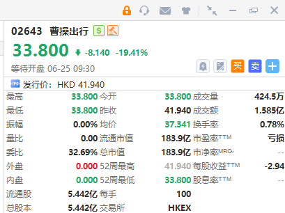 港股曹操出行今日挂牌,截至发稿跌19.41%,报33.80港元/股,中签一手账面浮亏814.0港元,最新总市值超183.93亿港元。该股此前公开发售获21.14倍认购,一手中签率50.0%。