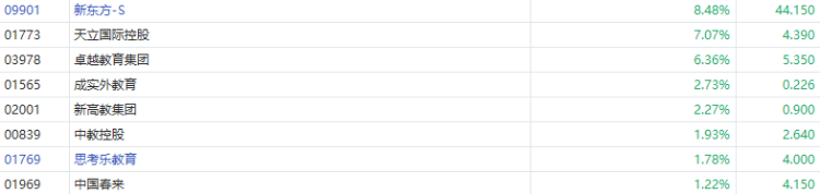6月25日消息,港股教育股继续昨日强势行情,其中,大地教育涨超9%,新东方大涨近9%,天立国际控股涨超7%,卓越教育集团涨超6%,立德教育涨超3%。