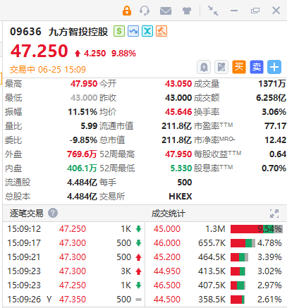 智通财经APP获悉,九方智投控股(09636)午后涨近10%,高见47.95港元,再创历史新高。截至发稿,涨9.88%,报47.25港元,成交额6.258亿港元。