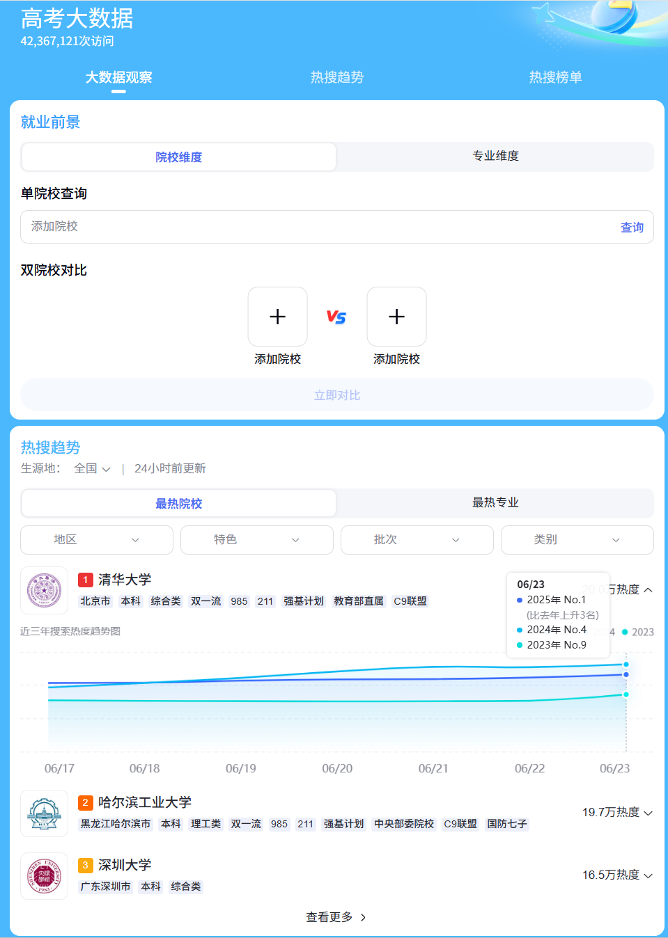 此外,百度还表示,平台上日均数十亿次搜索数据也能为高考志愿填报提供一个观察视角。搜索“高考大数据”,用户能看到全国上百万次访问沉淀出的趋势:哪些院校热度最高、最热专业排行如何,甚至每周的热度变化都能看到。