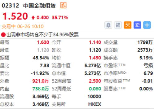 中国金融租赁(02312)昨日收涨234%,今日盘中再涨35%。截至发稿,股价上涨35.71%,现报1.52港元,成交额2573万港元。