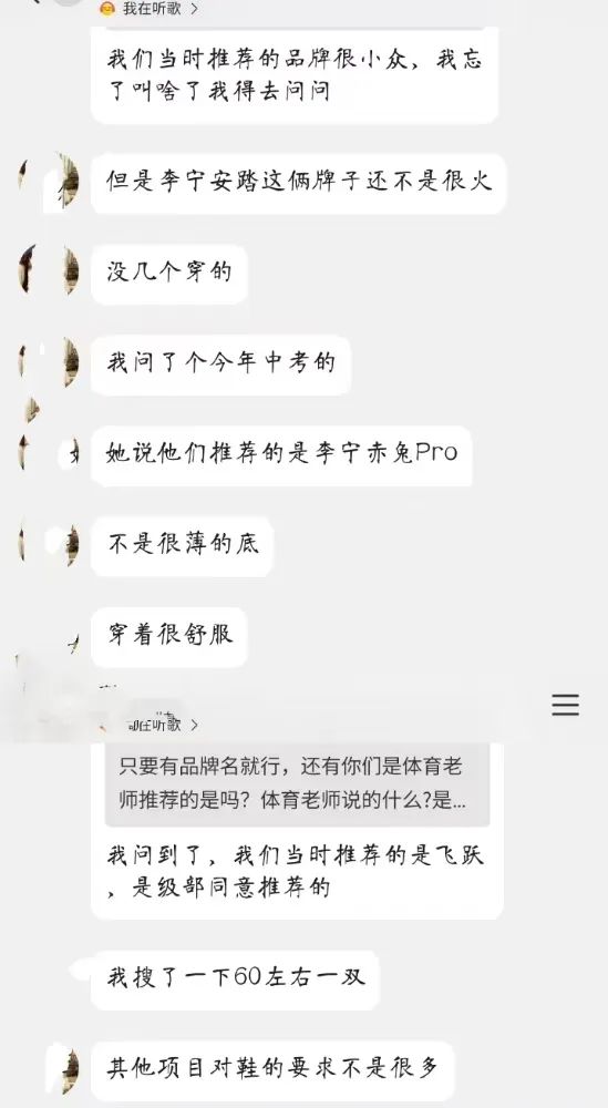 初三的学长告诉她,老师没针对体考指定用鞋,班里一般人都穿这类“潮”牌,专门的体考鞋,初二班上还不多见。“不过初三体考估计也得买,”她补充道,课间徐璇也偶尔听到男生讨论带碳板的跑鞋,对她和不少一线城市的同学来说,选择国际大牌也常出于一种“总归不会错”的心理。
