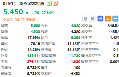 华兴资本控股(01911)现价升27.34%,报5.45港元,以现价计,该股暂连升3日,暂成交4485万港元。