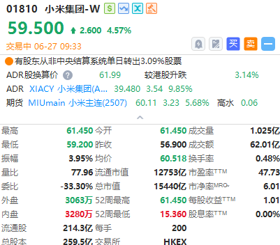 小米集团-W(01810)涨幅收窄至4.57%,开盘一度涨8%,最新总市值报15400亿港元。消息面上,小米昨晚发布了汽车、手机、AI穿戴、平板等多领域新品。其中,小米YU7标起售价25.35万元,3分钟大定突破20万台。新一代小折叠MIX Flip2 起售价5999元,小米AI眼镜起售价1999元。