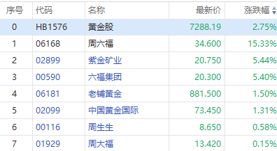 6月27日消息,港股黄金股拉升,其中,周六福涨超16%,紫金矿业涨超5%创历史新高,六福集团涨超5%,老铺黄金涨超1%。