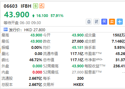 华盛资讯06月30日讯,港股IFBH今日挂牌,截至发稿涨57.91%,报43.90港元/股,中签一手账面浮盈3220.0港元,最新总市值超117亿港元。该股此前公开发售获2682.35倍认购,一手中签率10.0%。