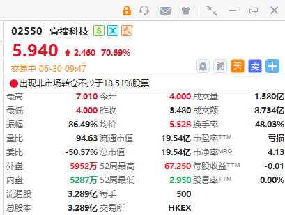 宜搜科技(02550)涨超70%,截至发稿,涨70.69%,报5.94港元,成交额1.58亿港元。