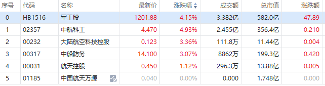 智通财经APP获悉,军工股延续近期涨势,截至发稿,中航科工(02357)涨4.93%,报4.47港元;中船防务(00317)涨3.07%,报14.1港元;航天控股(00031)涨1.12%,报0.45港元。
